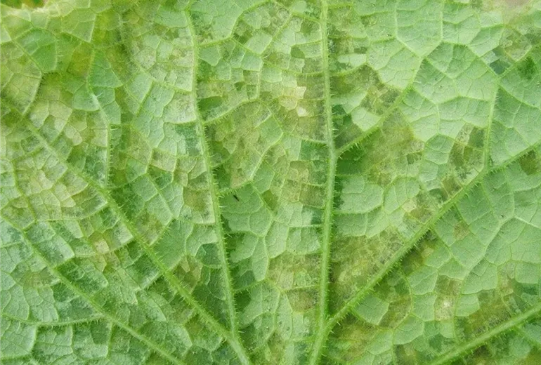 Im Sommer zeigen sich anfangs wässrige, kurz darauf, hellgrüne bis gelbbraune, durch die Blattadern begrenzte eckige Flecken auf den Blättern von Salat und Einlegegurken.
