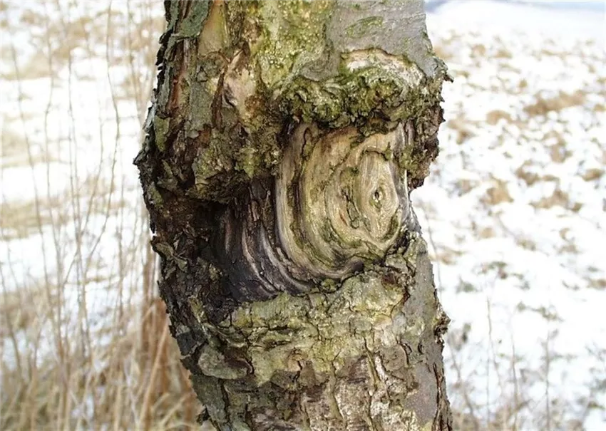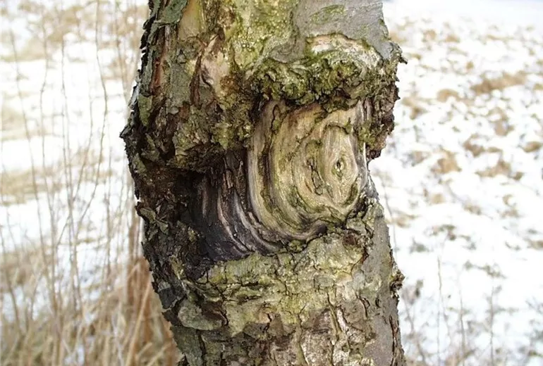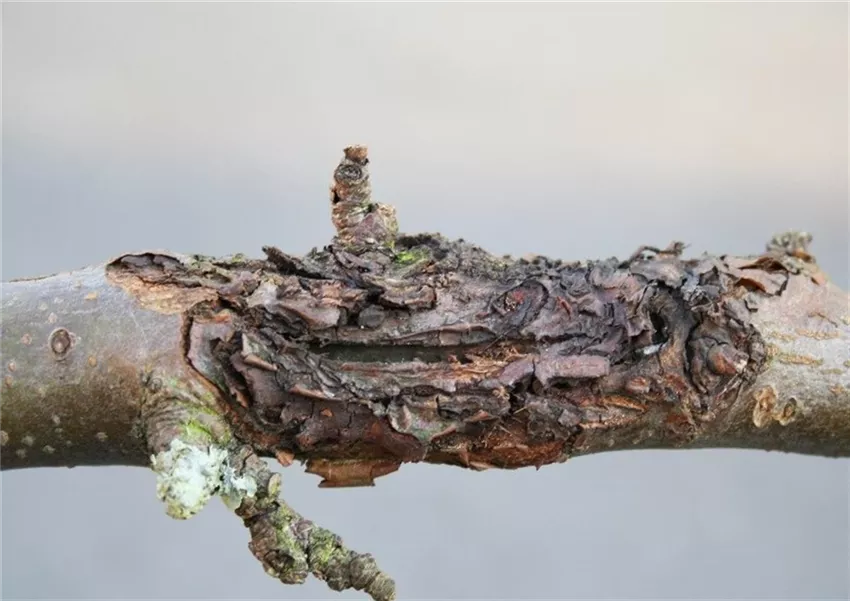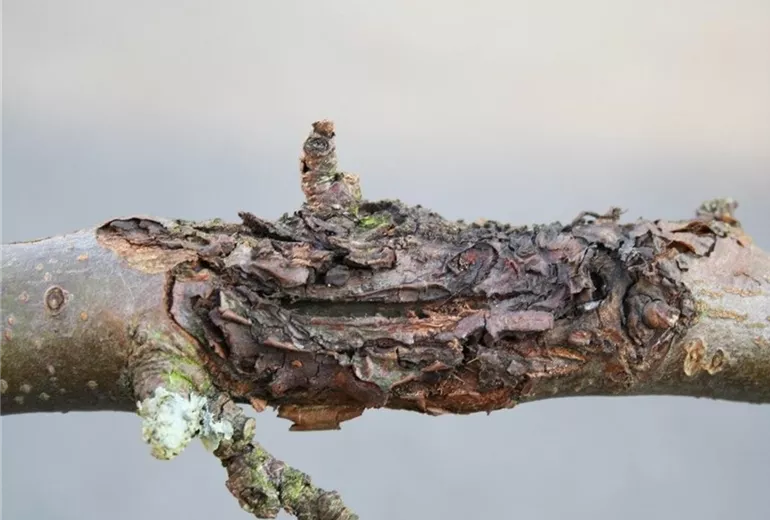 An dickeren Ästen ist die Rinde eingesunken. Die Oberfläche dieser abgestorbenen Partien reißt auf. Am Rande können sich Wucherungen bilden, die der Krankheit den Namen gaben. Werden junge Triebe befallen, stirbt die Rinde um die Knospen herum ab. Oberhalb der Befallsstelle werden die Zweige dürr.