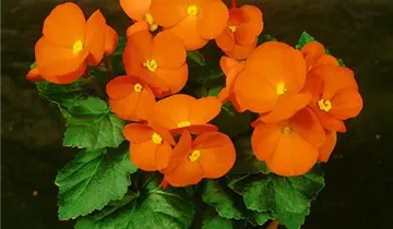 Die Begonie (Begonia elatior) ist eine orange blühende Pflanze, die dreieckige, gesägte Blätter trägt. Ihre schalenförmigen Blüten erscheinen von April bis September. Diese kompakte Pflanze gedeiht am besten an einem sonnigen bis halbschattigen Standort.