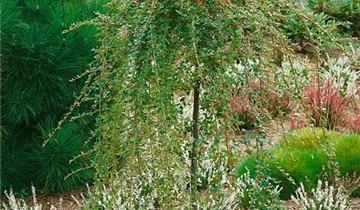 Besonders dekorativ sind die roten Beeren von Cotoneaster dammeri, Stamm. Diese erscheinen ab August.