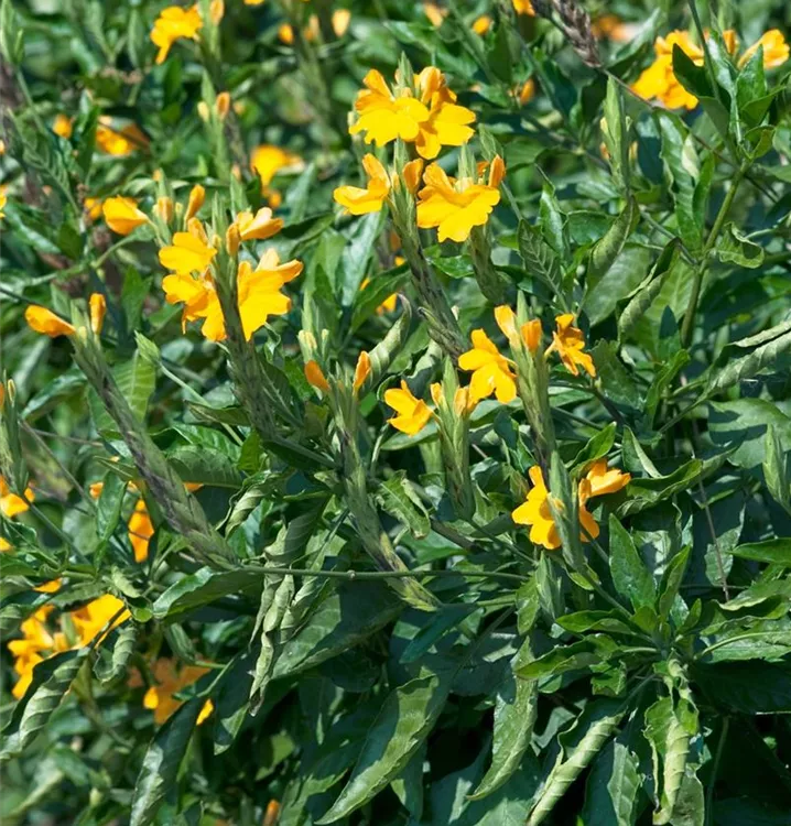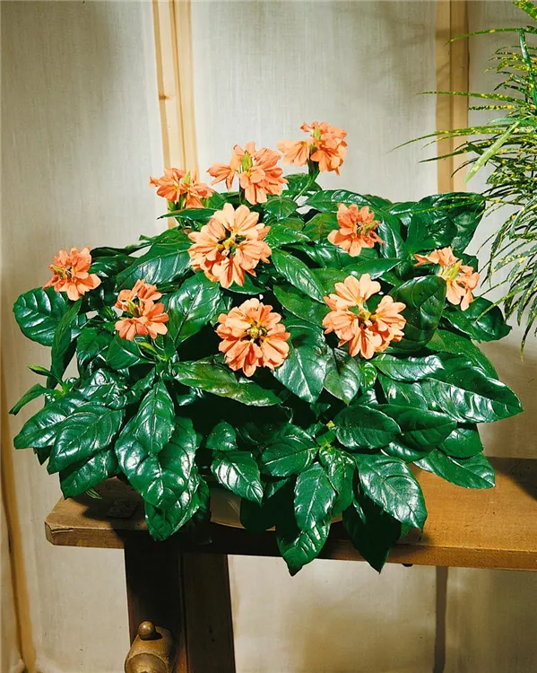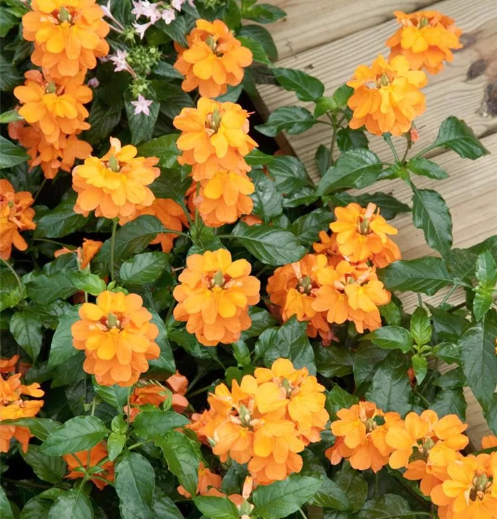 Die Crossandra (Crossandra infundibuliformis) ist eine orange blühende Pflanze, die lanzettliche, dunkelgrüne, glänzende, glänzende, gewellte Blätter trägt. Ihre tellerförmigen Blüten erscheinen in Ähren von April bis Oktober. Diese aufrechte und buschige Pflanze gedeiht am besten an einem sonnigen bis halbschattigen Standort.