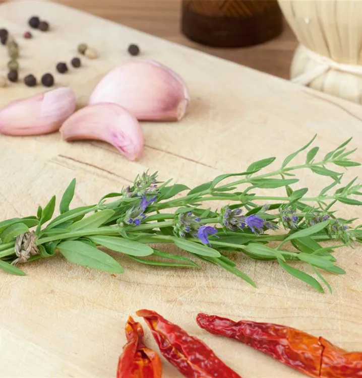 Der Apotheker-Ysop (Hyssopus officinalis) ist eine angenehm duftende Kräuterpflanze mit einem aromatischen Geschmack. Seine mittelgrünen Blätter sind lanzettlich. Für das optimale Wachstum des Apotheker-Ysops werden ein sonniger Standort und durchlässiger, nährstoffreicher Boden benötigt.