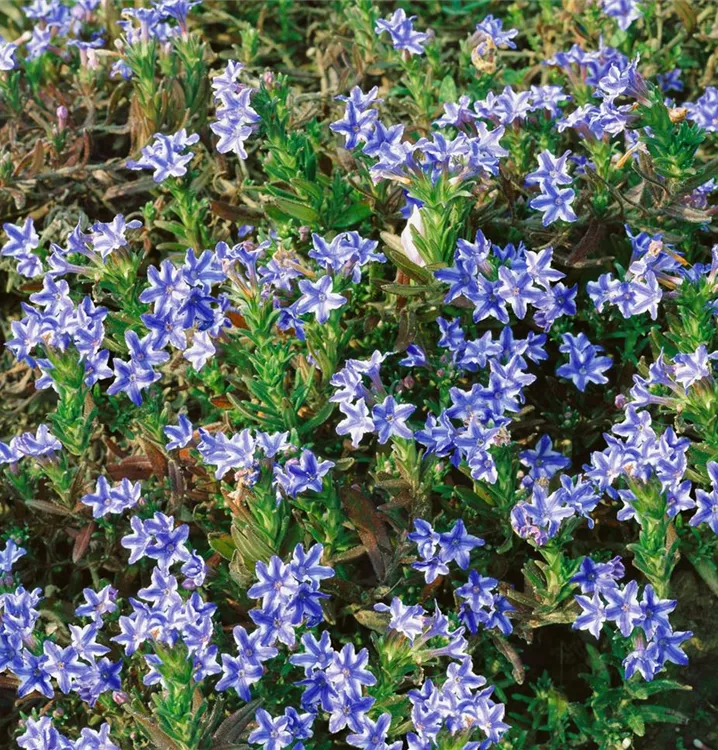Die Garten-Scheinsteinsame (Lithodora diffusa) ist eine mattenbildende wintergrüne Staude, die von Mai bis Juli blaue Blüten bildet. An einem sonnigen, windgeschützten Standort mit durchlässigem Boden erreicht sie gewöhnlich eine Höhe von ca. 20 cm und wird ca. 30 cm breit. Die Garten-Scheinsteinsame ist gut frostverträglich.