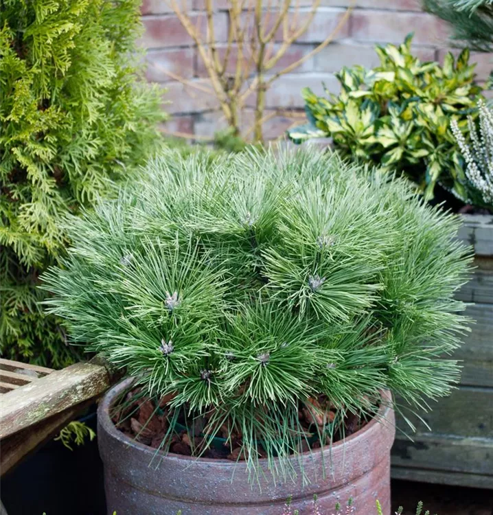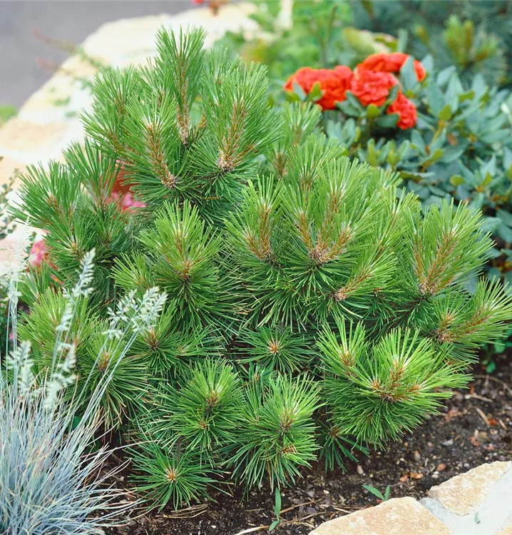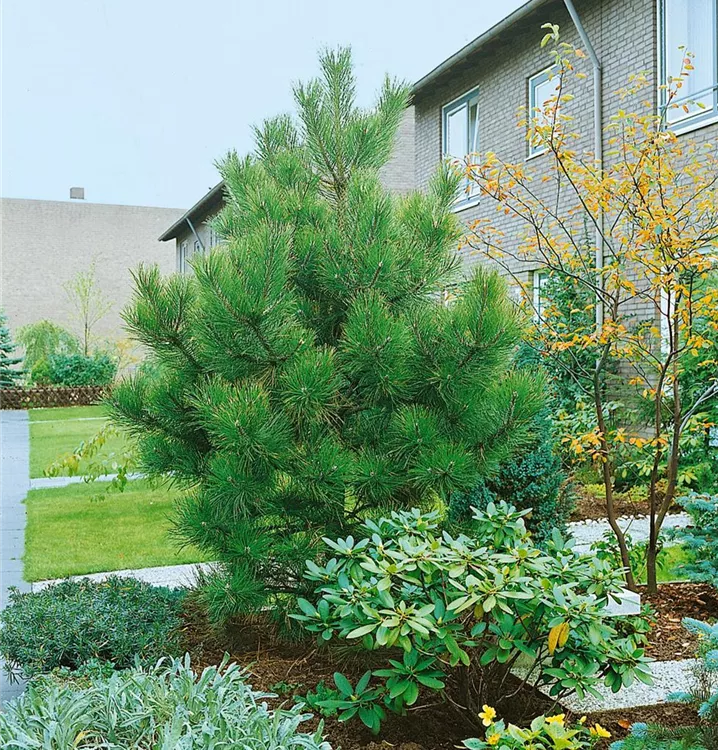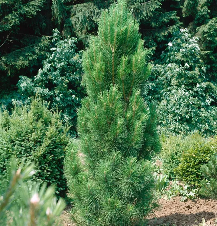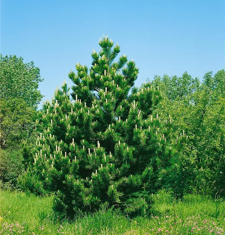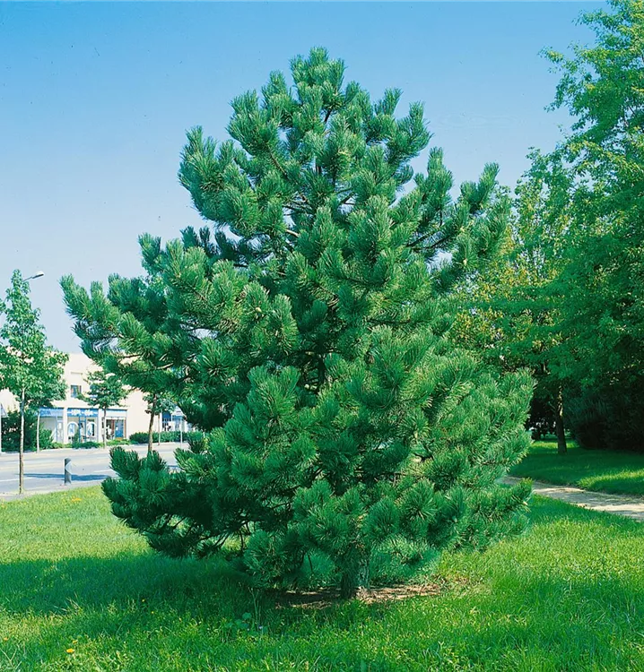 Die Schwarzkiefer (Pinus nigra) ist ein Gehölz, welches kegelförmig wächst und gewöhnlich eine Höhe von ca. 25 m und eine Breite von ca. 10 m erreicht. Ihre nadelförmigen Blätter haben eine dunkelgrüne Färbung. Dekorative braune Zapfen zieren Pinus nigra ab September. Dieses Gehölz ist gut frostverträglich. Sie bevorzugt durchlässigen, kalkhaltigen, sandigen Boden in sonniger Lage.
